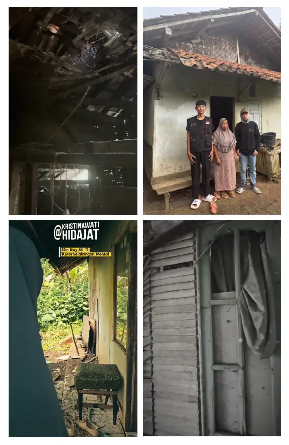 Rumahnya hampir roboh. Atapnya bocor, lantainya rapuh, dindingnya miring. Setiap kali hujan turun, ia hanya bisa menyandarkan diri di sudut kamar yang dianggap paling kering meski sebenarnya tetap basah juga. Untuk makan sehari-hari, ia bergantung pada kebaikan para tetangga yang masih peduli.